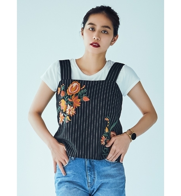 【送料無料】 ストライプの素材にVintage MODERNな印象のフラワーモチーフが刺繍されたキャミソール。1枚での着こなしはもちろん、レイヤードの着こなしも楽しめます。同モチーフ刺繍のBAGも展開しています。 ラグナムーン/LAGUNAMOON トップス|キャミソール