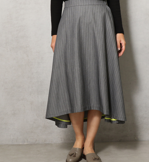 【送料無料】 フレアが美しい大人シルエットのミモレ丈スカート。後ろ見頃が長めで動く度に蛍光のライムカラーのパイピングが見えます。光沢あるグレー地のキレイ目生地に遊び心もプラス。スニーカーでカジュアルにパンプスでキレイ目にと幅広いコーディネイトで楽しめます。同じシルエットの無地イエローもあります。ウエストゴムポケットあり着丈 71ウエスト 68裾巾ALL 276 イアパピヨネ/ear PAPILLONNER スカート|スカート
