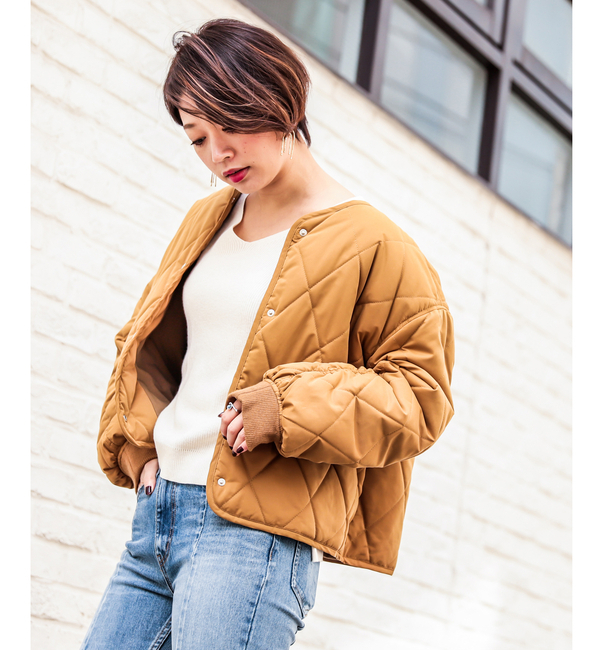 【送料無料】 春もまだまだ人気のキルティングアウター。少し短めの丈感は、スキニーはもちろん、ワイドパンツやフレアスカートなど、ボリュームのあるボトムでも相性良く着て頂けます。ゆったりしたサイズ感や、ノーカラーのデザインで、女性らしさも損なわずに使えるアイテムです。リブ部分は古着のブルゾンをイメージし、甘編みのリブを使用しているので、程よい抜け感がポイントに◎マットな生地感はカジュアルなキルティングアウターも少し大人な雰囲気に。軽い着心地が嬉しいおすすめの1着です。 チャオパニック/CIAOPANIC アウター|ブルゾン・スタジャン