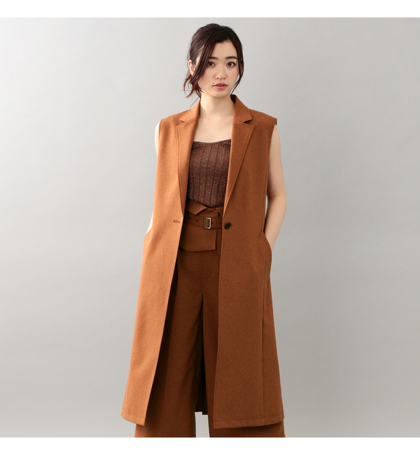 【送料無料】 今シーズン海外のコレクションでも多く見受けられたロングジレ。一昨年前のトレンドから再燃の予感です。LOVELESSからはアースカラーのブラウンを基調としたジレをリリース。秋のイメージがあるブラウンですが、今シーズンは春夏のトレンドカラーとして注目されています。『春夏にブラウンを羽織る』シーズンを錯誤するようなギャップが楽しめるアイテムです。なので表地には、トレンドの麻調合繊を使用。麻のようなドライタッチと爽やかさがあり、涼感のあるブラウンアイテムが完成しました。また、麻と比較してシワになりにくいのでイージーケアなのも嬉しいポイントです。初夏にかけては、ノースリーブのトップスとワイドパンツを合せて上から羽織るといったスタイリングがオススメです。また、同素材でワイドパンツ(品番:62R63707)のご用意もあるので、セットアップとしての着用もお楽しみ頂けます。モデル(下部ディテール画像):H168 B80 W59 H87 着用サイズ:36 ギルドプライム/GUILD PRIME アウター|ブルゾン・スタジャン
