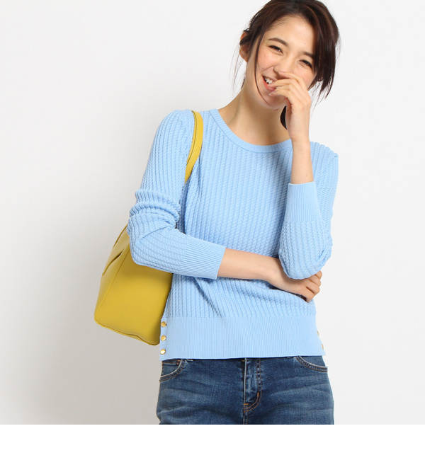 【送料無料】 サイドヘムを飾る煌くボタンにマリーンムードが高まるニット。ボディは縦のラインを強調するロープ編みでふっくらと立体感を持たせながらも、スッキリとした印象に。コンパクトなフォルムですから、パンツ、スカートと合わせるボトムを選びません。ホワイト(002)は透け感があるため、インナーの着用をおすすめします。サイズ違いの商品もご用意しております。S:127-14805モデル情報:身長172cm B80 W60 H85 着用サイズ:38店舗へのお問い合わせ商品番号:127-14417主に春に着用いただける商品です。 中国製 インディヴィ/INDIVI INDIVI|トップス|ニット・セーター